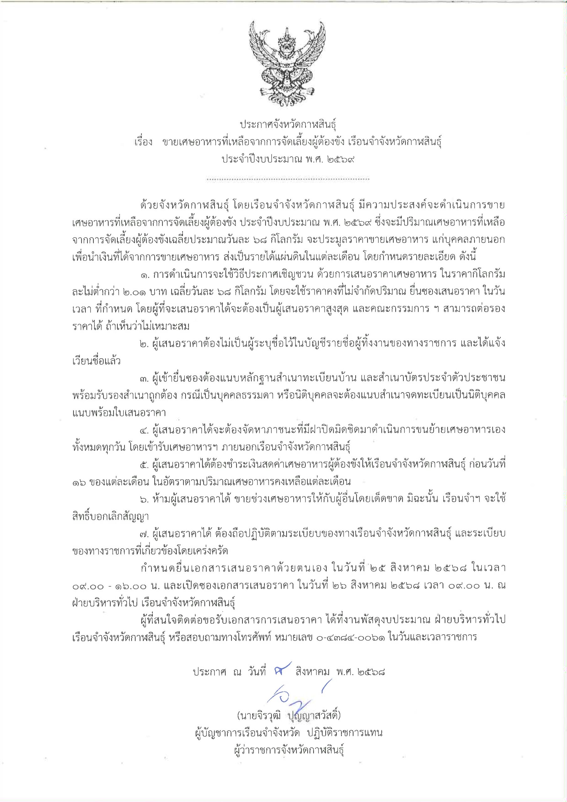 ประกาศ ขายเศษอาหารที่เหลือจากการจัดเลี้ยงผู้ต้องขัง เรือนจำจังหวัดกาฬสินธุ์ ประจำปีงบประมาณ พ.ศ. 2569