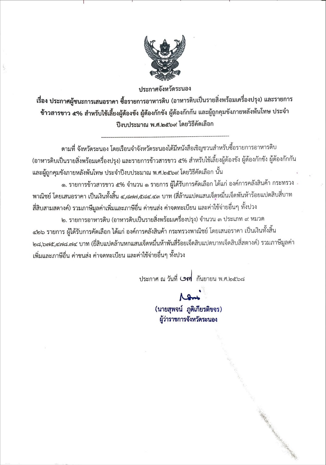 เรื่อง ประกาศผู้ชนะการเสนอราคา ซื้อรายการอาหารดิบ (อาหารดิบเป็นรายสิ่งพร้อมเครื่องปรุง) และข้าวสารขาว ๕% ประจำปีงบประมาณ พ.ศ.๒๕๖๙