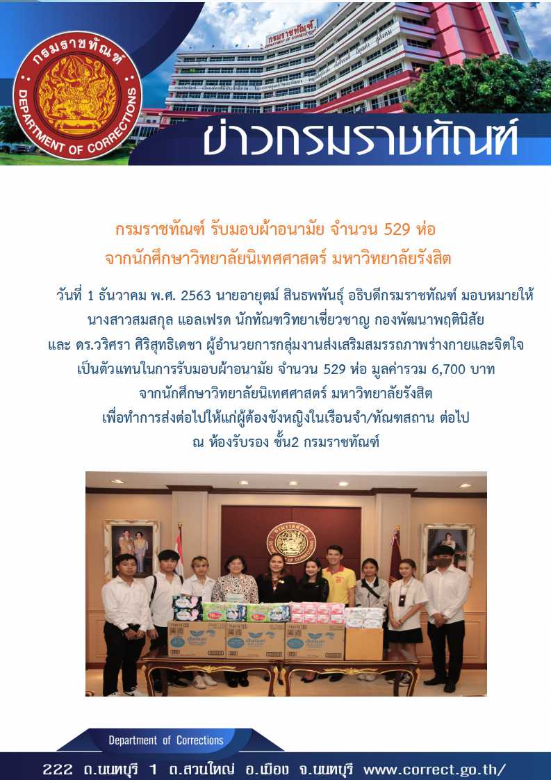 กรมราชทัณฑ์ โดยกลุ่มงานจริยธรรมกรมราชทัณฑ์ จัดกิจกรรมทำบุญตักบาตร ประจำเดือนเมษายน 2569 ประจำปีงบประมาณ พ.ศ. 2569 ครั้งที่ 4/2569 และเนื่องวันพระราชสมภพสมเด็จพระกนิษฐาธิราชเจ้า กรมสมเด็จพระเทพรัตนราชสุดาฯ สยามบรมราชกุมารี 2 เมษายน 2569