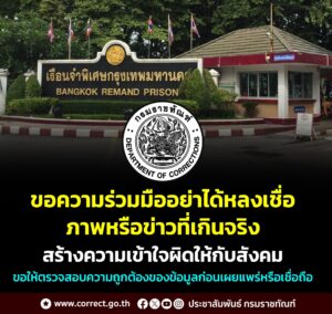 “ราชทัณฑ์ ขอความร่วมมืออย่าได้หลงเชื่อภาพหรือข่าวที่เกินจริง สร้างความเข้าใจผิดให้กับสังคม”