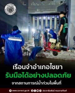 👉กรมราชทัณฑ์ ได้รับรายงานจากเรือนจำอำเภอไชยา โดยเบื้องต้นเรือนจำฯ ได้บริหารจัดการด้วยการย้ายผู้ต้องขังขึ้นบนเรือนนอนชั้นสอง พร้อมจัดเตรียมอาหาร และเครื่องดื่มให้เพียงพอต่อความต้องการของผู้ต้องขัง ซึ่งปัจจุบันสถานการณ์น้ำภายในเรือนจำฯ สามารถคลี่คลายและเริ่มทำความสะอาดได้ในบางพื้นที่ เพื่อให้สามารถกลับมาใช้งานได้ตามปกติ ซึ่งทางเรือนจำฯ ได้ดำเนินการตามแผนป้องกันและระงับเหตุการณ์ภัยพิบัติ (อุทกภัย) ได้อย่างทันท่วงที หากต้องมีการขนย้ายอุปกรณ์ หรือเอกสารสำคัญของผู้ต้องขัง รวมถึงการเฝ้าระวังตรวจสอบระบบไฟฟ้าสำรอง ตลอดจนการเพิ่มความระมัดระวังในการควบคุมดูแลผู้ต้องขังทั้งกลางวันและกลางคืน โดยให้เจ้าหน้าที่ทุกคนปฏิบัติหน้าที่อย่างเคร่งครัด พร้อมติดตามข่าวสารความเคลื่อนไหวของสถานการณ์น้ำท่วมอย่างต่อเนื่อง นอกจากนี้ กรมราชทัณฑ์ โดยศูนย์ช่วยเหลือผู้ประสบอุทกภัยภาคใต้ กระทรวงยุติธรรม ได้มอบหมายให้เรือนจำและทัณฑสถานในสังกัดเขต 8 เข้าให้ความช่วยเหลือ โดยได้ระดมกำลังเจ้าหน้าที่และผู้ต้องขัง ออกปฏิบัติภารกิจร่วมกับหน่วยงานในพื้นที่ เพื่อบรรเทาความเดือดร้อนและสนับสนุนการฟื้นฟูเบื้องต้นแก่เรือนจำฯ และประชาชนที่ได้รับผลกระทบจากอุทกภัยในครั้งนี้