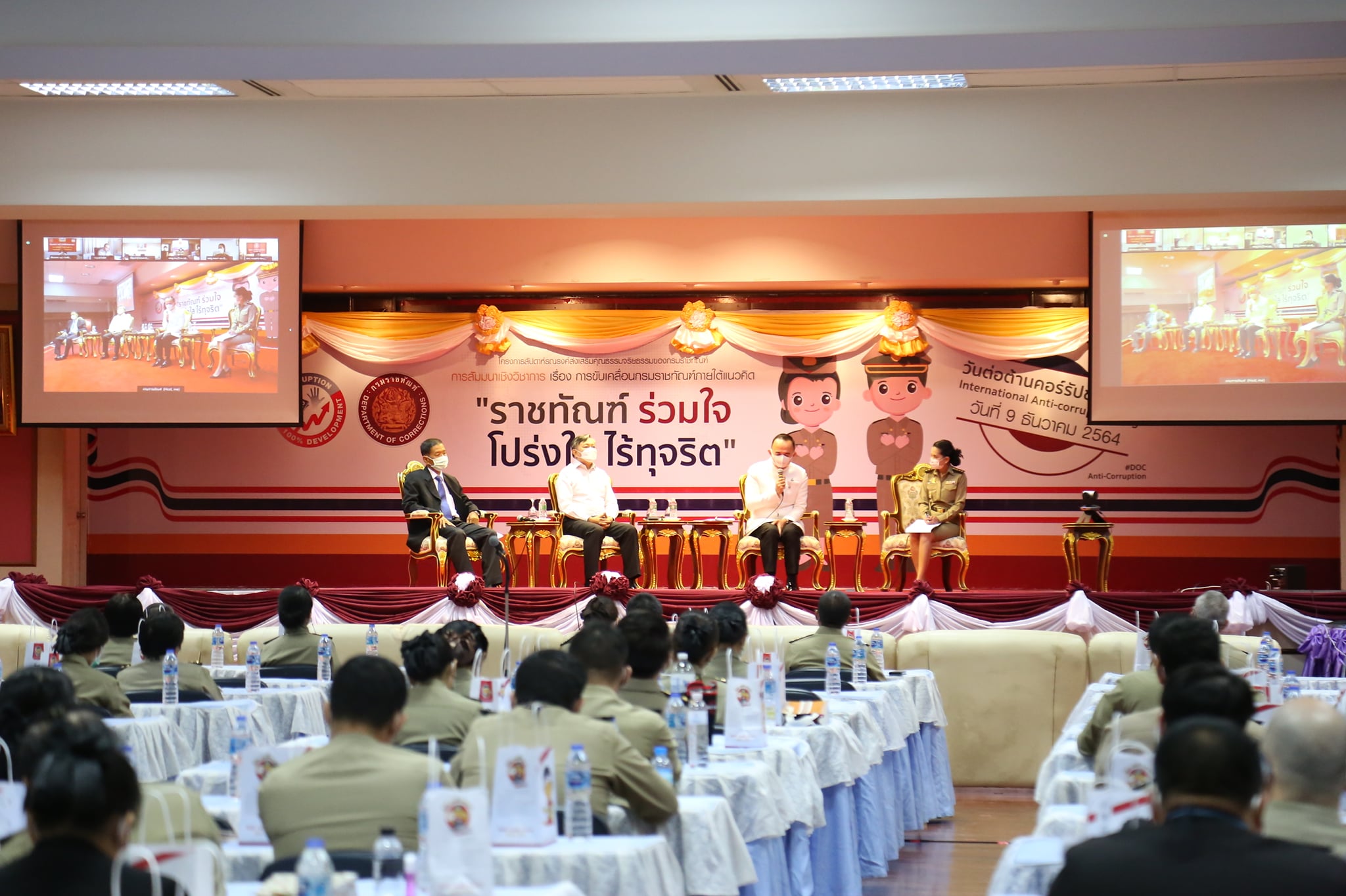 เมื่อวันที่ ๙ ธันวาคม ๒๕๖๔ ณ ห้องสัมมนากรมราชทัณฑ์ ชั้น ๓ อาคารกรมราชทัณฑ์ จังหวัดนนทบุรี นายอายุตม์ สินธพพันธุ์ อธิบดีกรมราชทัณฑ์ เป็นประธานเปิดการสัมมนาเชิงวิชาการ เรื่อง การขับเคลื่อนกรมราชทัณฑ์ภายใต้แนวคิด “ราชทัณฑ์ร่วมใจ โปร่งใส ไร้ทุจริต” โดยมี นายธวัชชัย ชัยวัฒน์ รองอธิบดีกรมราชทัณฑ์ นายณรงค์ จุ้ยเส่ย รองอธิบดีกรมราชทัณฑ์ พร้อมด้วยข้าราชการ และเจ้าหน้าที่จากเรือนจำ/ทัณฑสถานทั่วประเทศ ๑๔๓ แห่ง ร่วมรับชมการสัมมนาฯ ผ่านระบบออนไลน์ Webex เพื่อเป็นการเปิดเวทีอภิปรายให้บุคลากรกรมราชทัณฑ์ได้ร่วมแสดงความคิดเห็น แลกเปลี่ยนประสบการณ์ ร่วมกัน สร้างแนวทางการขับเคลื่อนกรมราชทัณฑ์สู่ความโปร่งใส ไร้ทุจริตคอร์รัปชัน โดยการสัมมนาฯ ครั้งนี้ ได้รับเกียรติจากวิทยากรผู้ทรงคุณวุฒิ ประกอบด้วย หม่อมหลวงปนัดดา ดิศกุล สมาชิกวุฒิสภา นายธาดา เตียประเสริฐ กรรมการองค์กรต่อต้านคอร์รัปชัน (ประเทศไทย) และ ดร.นัทธี จิตสว่าง ที่ปรึกษาสถาบัน เพื่อการยุติธรรมแห่งประเทศไทย (TIJ) ร่วมอภิปราย