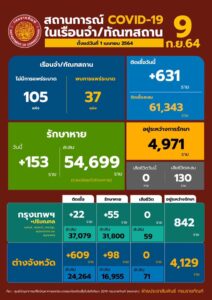 วันพฤหัสบดีที่ 9 กันยายน 2564 เวลา 12.00 นาฬิกา นายอายุตม์ สินธพพันธุ์ อธิบดีกรมราชทัณฑ์ เปิดเผยถึงสถานการณ์การแพร่ระบาดของโรคติดเชื้อไวรัสโควิด-19 ในเรือนจำและทัณฑสถาน (ข้อมูล ณ วันที่ 8 กันยายน 2564 เวลา 16.00 นาฬิกา) พบผู้ติดเชื้อรายใหม่ 631 ราย (พบในเรือนจำสีแดง 600 ราย และพบในห้องแยกกักโรคผู้ต้องขังรับใหม่ 31 ราย) รักษาหายเพิ่ม 153 ราย ไม่มีรายงานผู้ต้องขังเสียชีวิตในวันนี้