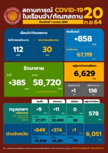 วันจันทร์ที่ 20 กันยายน 2564 เวลา 12.00 นาฬิกา นายอายุตม์ สินธพพันธุ์ อธิบดีกรมราชทัณฑ์ เปิดเผยถึงสถานการณ์การแพร่ระบาดของโรคติดเชื้อไวรัสโควิด-19 ในเรือนจำและทัณฑสถาน (ข้อมูล ณ วันที่ 19 กันยายน 2564 เวลา 16.00 นาฬิกา) พบผู้ติดเชื้อรายใหม่ 858 ราย (พบในเรือนจำสีแดง 842 ราย และพบในห้องแยกกักโรคผู้ต้องขังรับใหม่ 16 ราย) รักษาหายเพิ่ม 385 ราย เสียชีวิต 1 ราย ทำให้มีผู้ติดเชื้อที่ยังอยู่ในการดูแลของกรมราชทัณฑ์ 6,629 ราย (กลุ่มสีเขียว 85.8% สีเหลือง 13.9% และสีแดง 0.3%) เป็นพื้นที่กรุงเทพมหานคร 452 ราย (รวมทัณฑสถานโรงพยาบาลราชทัณฑ์) ปริมณฑล 126 ราย และต่างจังหวัด 6,051 ราย