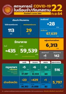 📌วันพุธที่ 22 กันยายน 2564 เวลา 12.00 นาฬิกา นายอายุตม์ สินธพพันธุ์ อธิบดีกรมราชทัณฑ์ เปิดเผยถึงสถานการณ์การแพร่ระบาดของโรคติดเชื้อไวรัสโควิด-19 ในเรือนจำและทัณฑสถาน (ข้อมูล ณ วันที่ 21 กันยายน 2564 เวลา 16.00 นาฬิกา) พบผู้ติดเชื้อรายใหม่ 28 ราย (พบในเรือนจำสีแดง 22 ราย และพบในห้องแยกกักโรคผู้ต้องขังรับใหม่ 6 ราย) รักษาหายเพิ่ม 435 ราย เสียชีวิต 1 ราย ทำให้มีผู้ติดเชื้อที่ยังอยู่ในการดูแลของกรมราชทัณฑ์ 6,313 ราย (กลุ่มสีเขียว 86.7% สีเหลือง 12.9% และสีแดง 0.4%) เป็นพื้นที่กรุงเทพมหานคร 397 ราย (รวมทัณฑสถานโรงพยาบาลราชทัณฑ์) ปริมณฑล 119 ราย และต่างจังหวัด 5,797 ราย