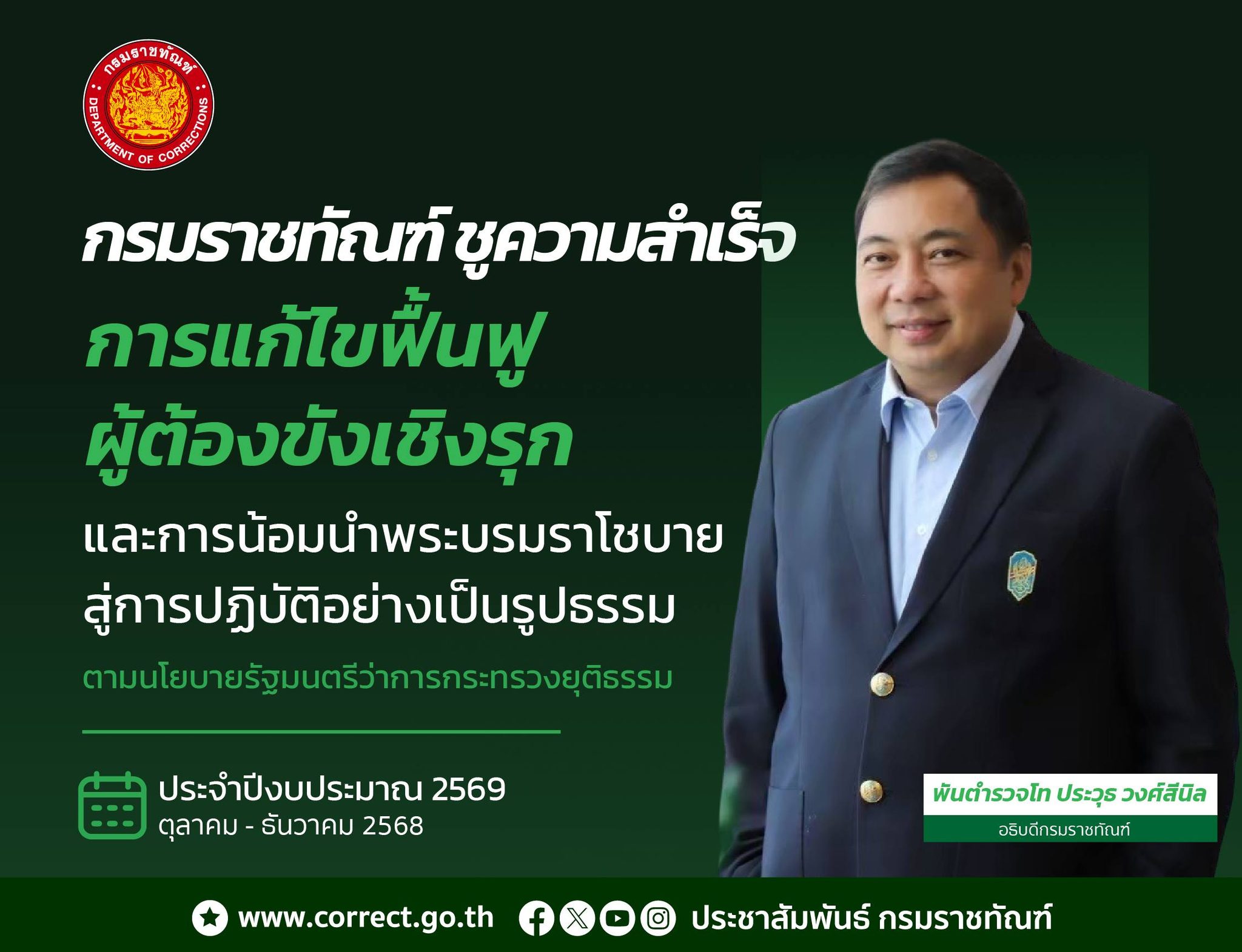 กรมราชทัณฑ์ ภายใต้นโยบายของ พันตำรวจโท ประวุธ วงศ์สีนิล อธิบดีกรมราชทัณฑ์ ให้ความสำคัญกับการบริหารงานราชทัณฑ์ให้ทันสมัย โปร่งใส และมีประสิทธิภาพ รวมทั้งการขับเคลื่อนภารกิจด้านการพัฒนาพฤตินิสัยและการฟื้นฟูผู้ก้าวพลาด เพื่อให้สามารถกลับคืนสู่สังคมได้อย่างมีคุณค่า ในการดำเนินโครงการและกิจกรรมสำคัญตามนโยบายรัฐมนตรีว่าการกระทรวงยุติธรรม (Quick Win) ประจำปีงบประมาณ พ.ศ. 2569 ในช่วงเดือนตุลาคม – ธันวาคม 2568 โดยมุ่งเน้นการพัฒนาระบบงานราชทัณฑ์ให้สอดคล้องกับหลักนิติธรรม ควบคู่กับการยกระดับคุณภาพชีวิตผู้ต้องขังเพื่อเสริมสร้างโอกาสในการคืนคนดีสู่สังคม ได้แก่