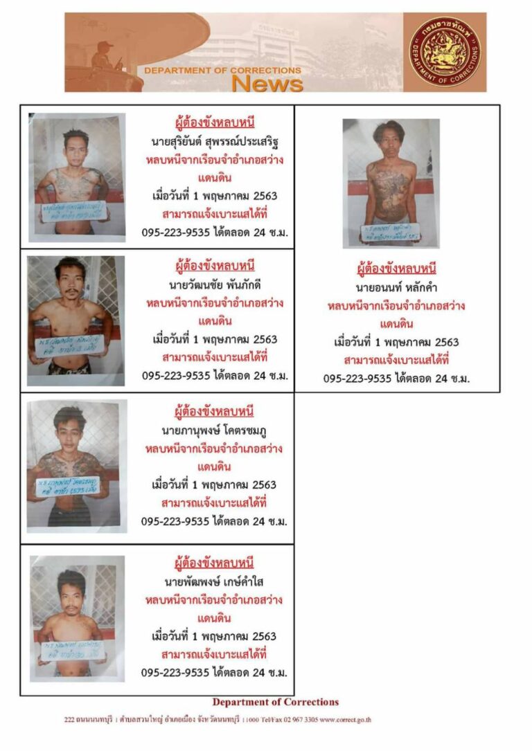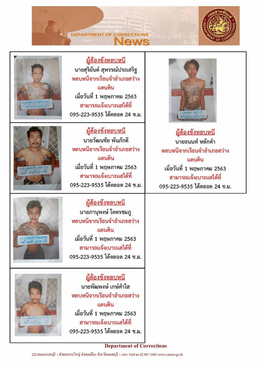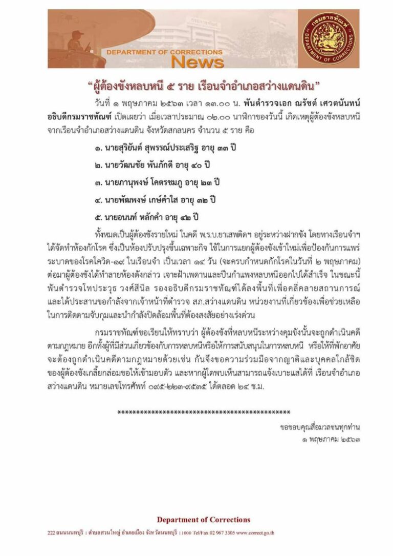 1 พฤษภาคม 2563 เวลาประมาณ 02.00 น. ผู้ต้องขังเรือนจำอำเภอสว่างแดนดิน จังหวัดสกลนคร หลบหนีจำนวน 5 ราย โดยทั้งหมดถือโอกาสในช่วงที่ถูกควบคุมตัวอยู่ที่ห้องกักโรค ทำลายห้องเจาะฝ้าเพดานและปีนกำแพงหลบหนีออกไปได้
