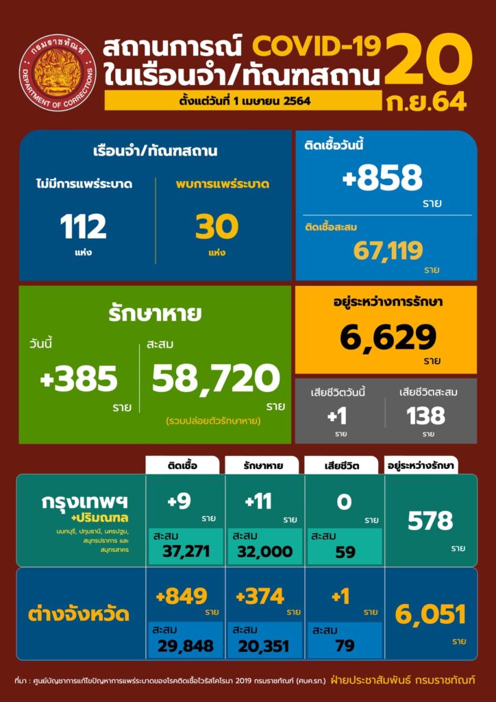 สถานการณ์โควิดในเรือนจํา/ทัณฑสถานประจำวันที่ 20 กันยายน 2564