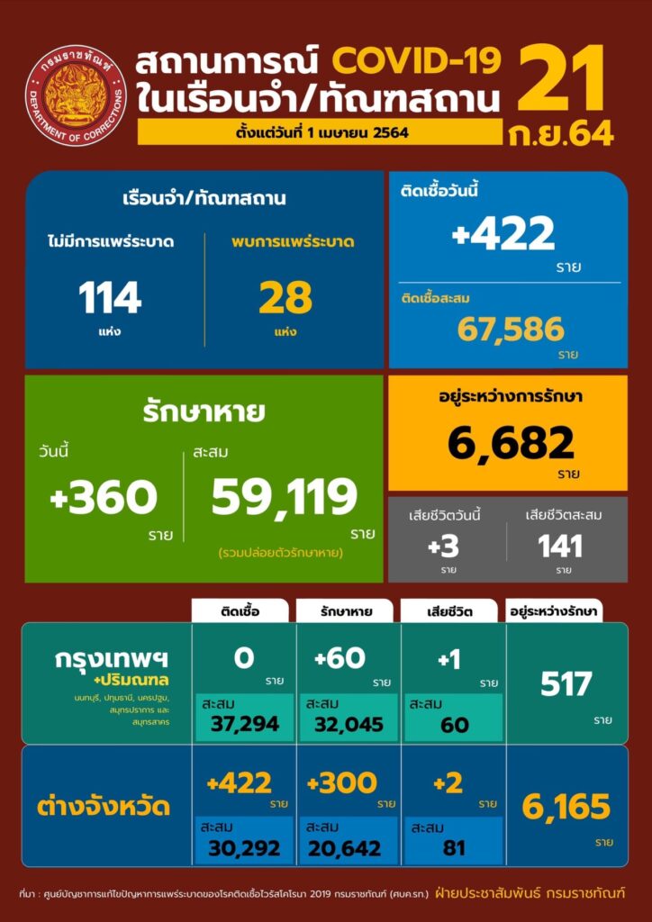 สถานการณ์โควิดในเรือนจํา/ทัณฑสถานประจำวันที่ 21 กันยายน 2564