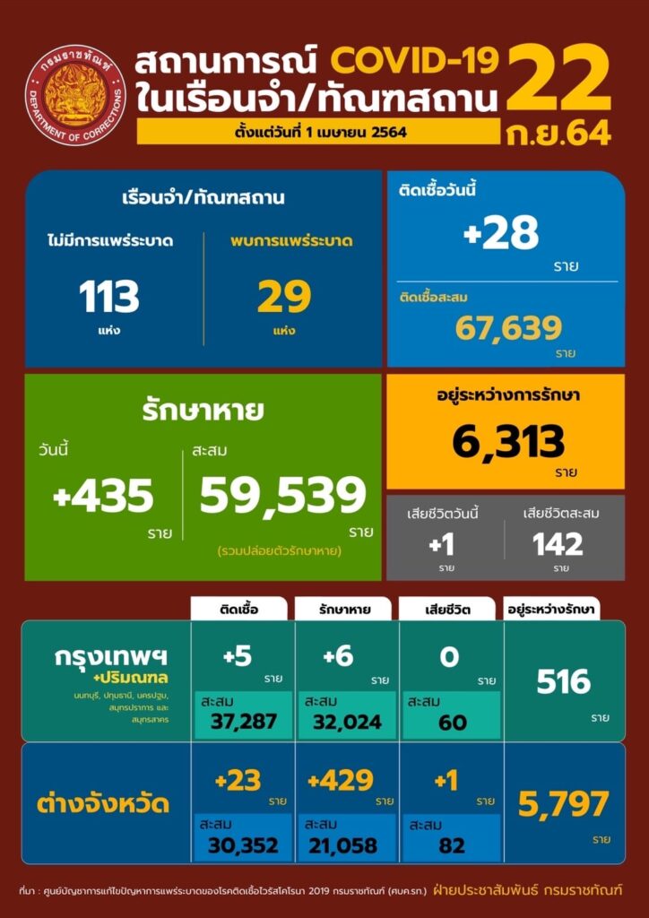 สถานการณ์โควิดในเรือนจํา/ทัณฑสถานประจำวันที่ 22 กันยายน 2564