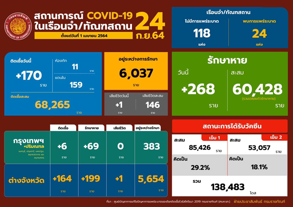 สถานการณ์โควิดในเรือนจํา/ทัณฑสถานประจำวันที่ 24 กันยายน 2564