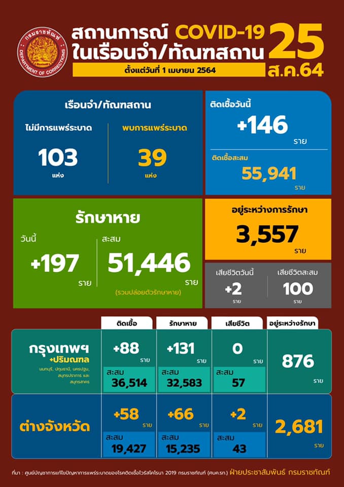 สถานการณ์โควิดในเรือนจํา/ทัณฑสถานประจำวันที่ 25 สิงหาคม 2564