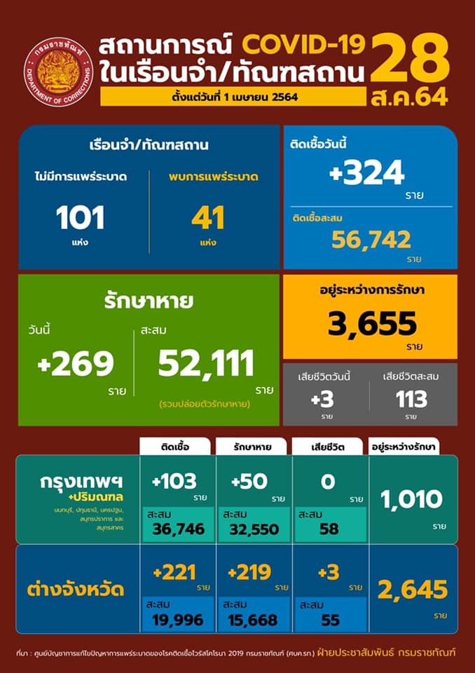 สถานการณ์โควิดในเรือนจํา/ทัณฑสถานประจำวันที่ 28 สิงหาคม 2564