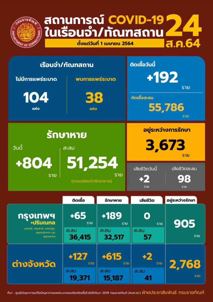 สถานการณ์โควิดในเรือนจํา/ทัณฑสถานประจำวันที่ 24 สิงหาคม 2564