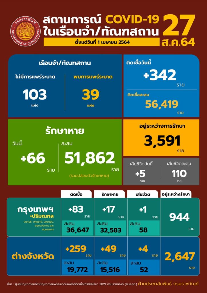 สถานการณ์โควิดในเรือนจํา/ทัณฑสถานประจำวันที่ 27 สิงหาคม 2564