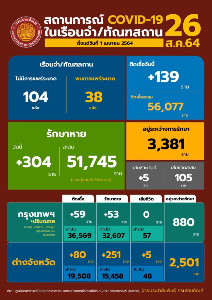 สถานการณ์โควิดในเรือนจํา/ทัณฑสถานประจำวันที่ 26 สิงหาคม 2564