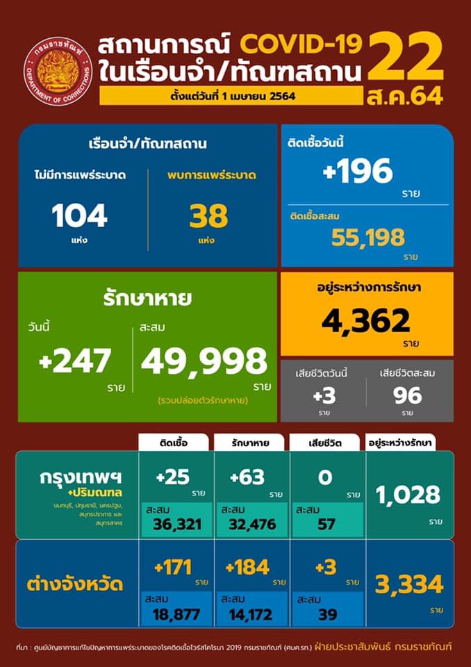 สถานการณ์โควิดในเรือนจํา/ทัณฑสถานประจำวันที่ 22 สิงหาคม 2564