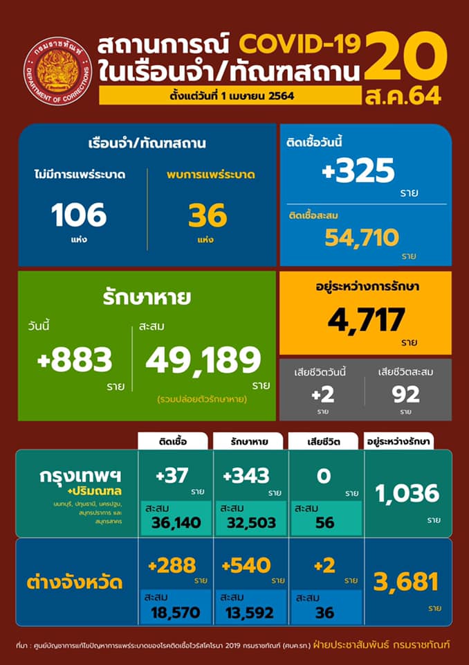 สถานการณ์โควิดในเรือนจํา/ทัณฑสถานประจำวันที่ 20 สิงหาคม 2564
