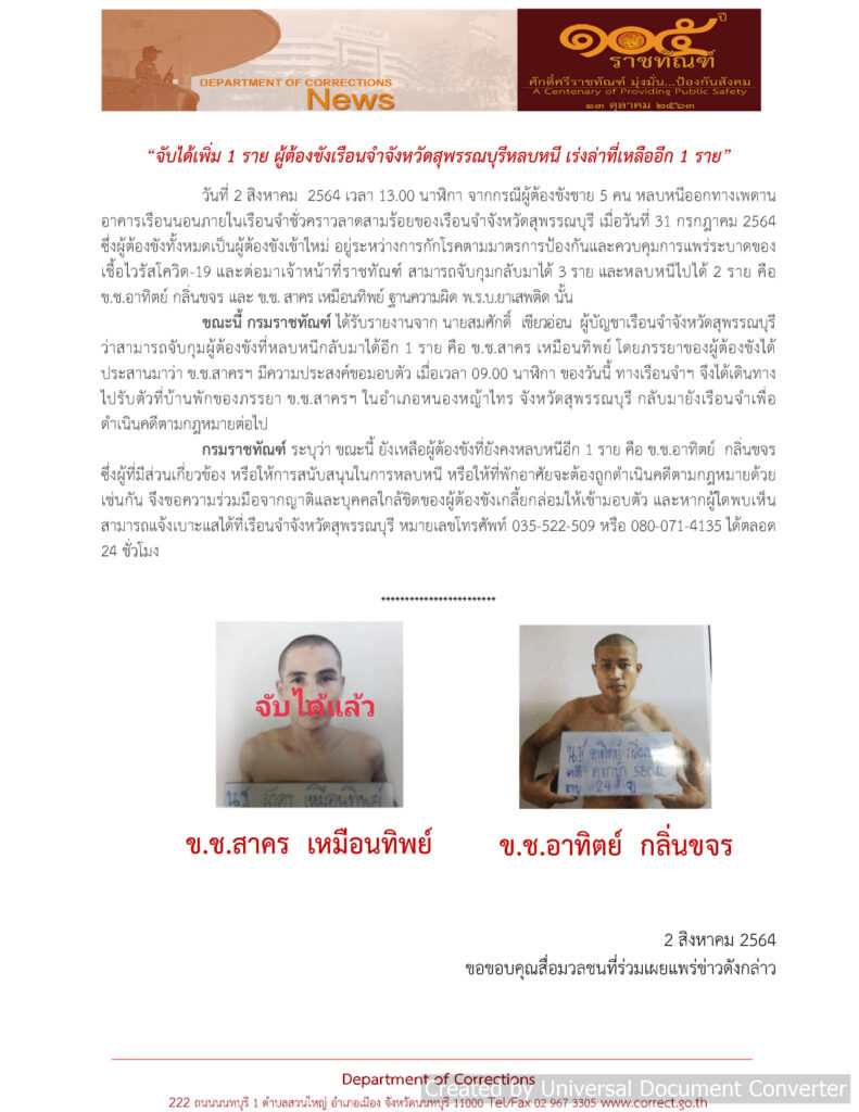 “จับได้เพิ่ม 1 ราย ผู้ต้องขังเรือนจำจังหวัดสุพรรณบุรีหลบหนี เร่งล่าที่เหลืออีก 1 ราย”