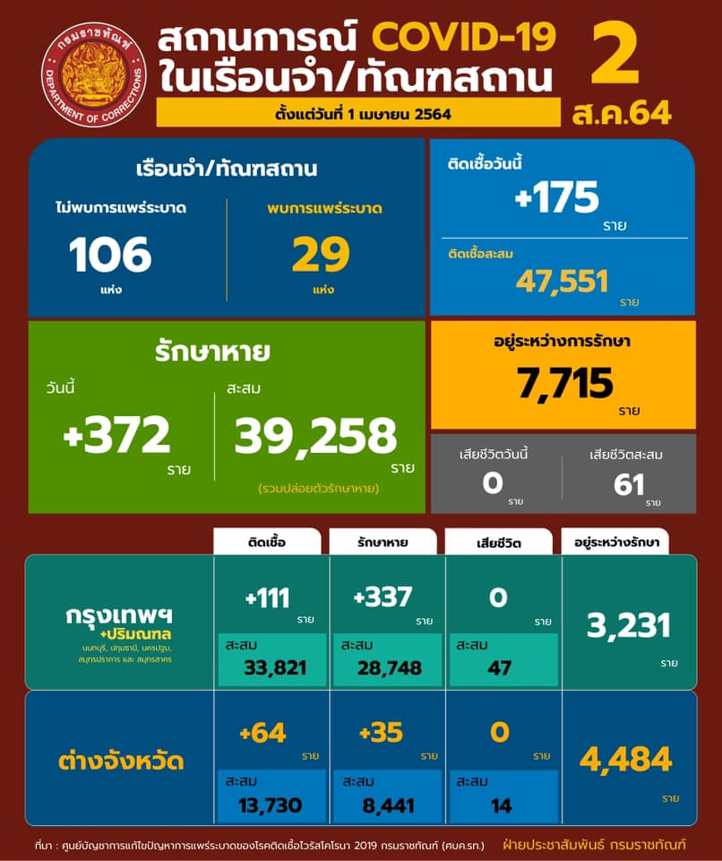 สถานการณ์โควิดในเรือนจํา/ทัณฑสถานประจำวันที่ 2 สิงหาคม 2564