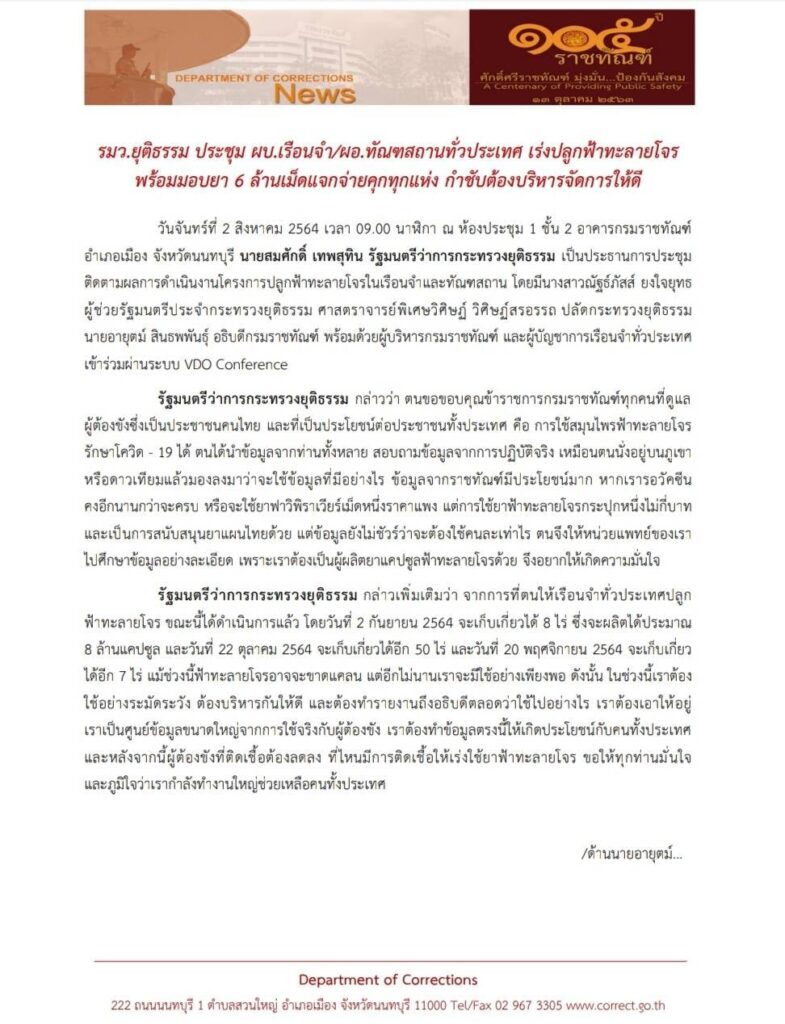 “รมว.ยุติธรรม ประชุม ผบ.เรือนจำ/ผอ.ทัณฑสถานทั่วประเทศ เร่งปลูกฟ้าทะลายโจร พร้อมมอบยา 6 ล้านเม็ดแจกจ่ายคุกทุกแห่ง กำชับต้องบริหารจัดการให้ดี”