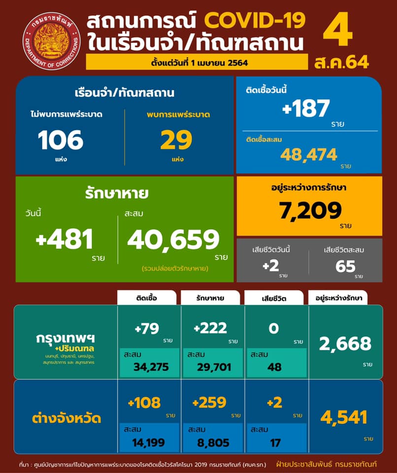 สถานการณ์โควิดในเรือนจํา/ทัณฑสถานประจำวันที่ 4 สิงหาคม 2564