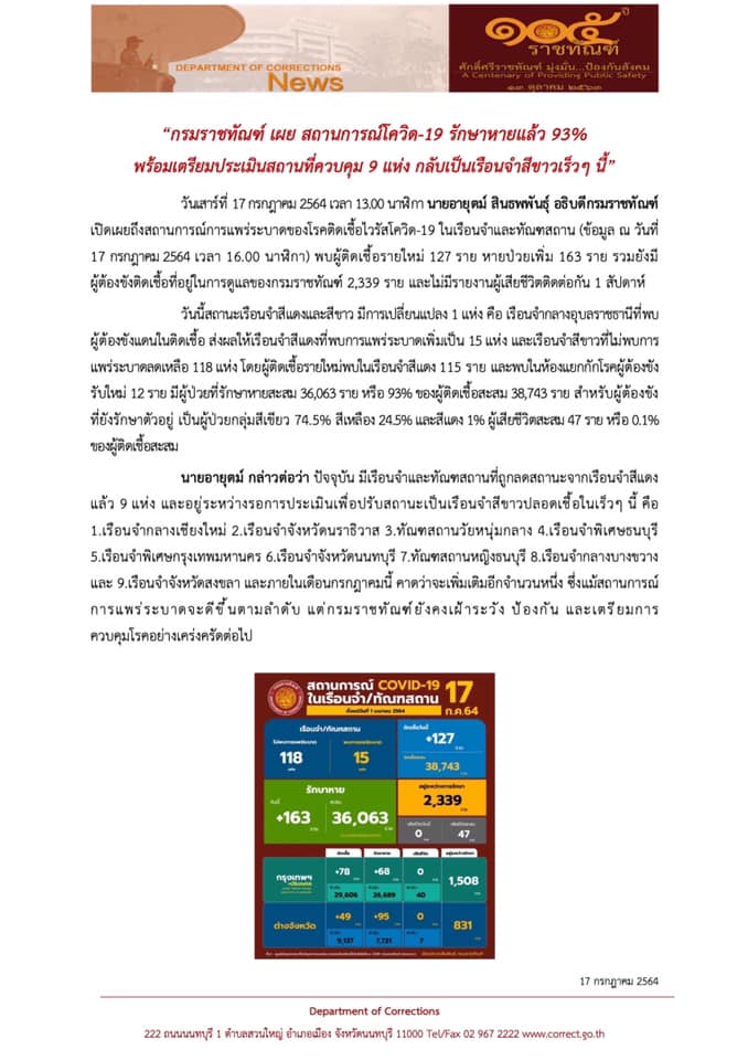 สถานการณ์โควิดในเรือนจํา/ทัณฑสถานประจำวันที่ 17 ก.ค. 64