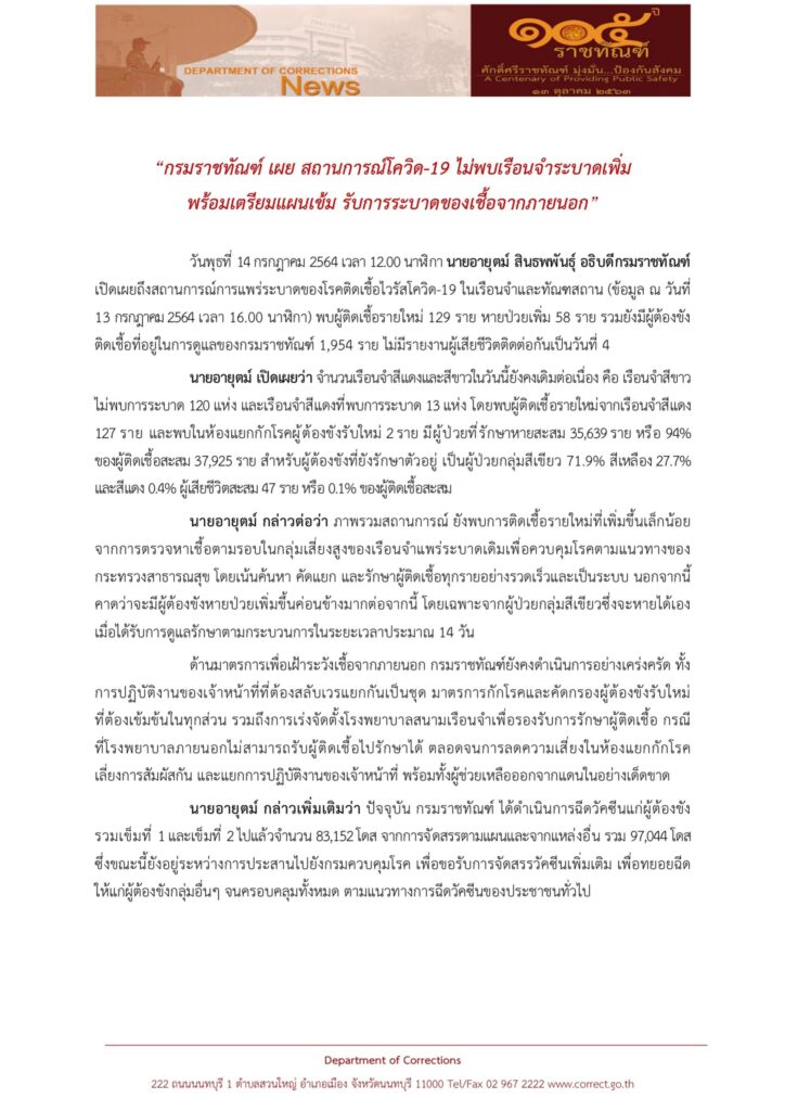 สถานการณ์โควิดในเรือนจํา/ทัณฑสถานประจำวันที่ 14 ก.ค. 64