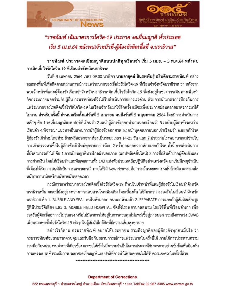 ราชทัณฑ์ ประกาศ งดเยี่ยมญาติ ทั่วประเทศ เริ่ม 5 เม.ย.64 หลังพบเจ้าหน้าที่-ผู้ต้องขังติดเชื้อที่ จ.นราธิวาส