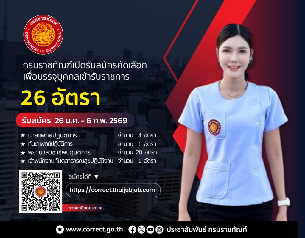 กรมราชทัณฑ์ รับสมัครคัดเลือกเพื่อบรรจุบุคคลเข้ารับราชการในสังกัดกรมราชทัณฑ์ 26 อัตรา